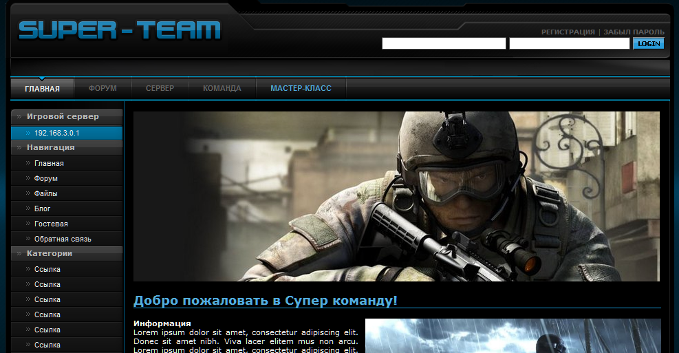 Шаблон "SUPER-TEAM" создан на базе дизайна от студии "ROCCAT". Поэтому отличается от других разработок для платформы UCOZ тем, что для изменения внешнего вида сайта используются глобальные блоки. Это позволило в построении, немного отойти от привычного шаблона. В глобальные блоки необходимо вписывать ту информацию, которая несет долговременную смысловую нагрузку. Возможно применение стандартных ИНФОРМЕРОВ для отображения текущей информации. Также в шаблоне впервые применена новая форма Персональной страницы... Хотя эта функция заложена в UCOZ с самого начала, но ее практически никогда не использовали для построения шаблонов. Даже не знаю почему!? В самом каркасе шаблона используется CSS, т. е. DIV-ная система. Что позволяет легко изменить сам дизайн и цвет шаблона... Нужно только заменить соответствующие картинки на свои с заданными размерными параметрами. К сожалению я не имел достаточно времени для рисования иконок для форума... Вы можете использовать практически любые вам понравившиеся. Добавлю ещё, я не пытался сделать готовый сайт... Поэтому многое в шаблоне вы должны придумать сами. Но как обычно добавлю, что изначально вы должны поставить весь шаблон полностью и только затем его изменять... Вся красота дизайна этого шаблона, заключена в глобальных блоках... И если вы откажетесь от них! Шаблон потеряет свою привлекательность... Шаблон "SUPER-TEAM" предназначен в первую очередь для тех, кто уже понимает как работает система UCOZ. Хотя новички, тоже могут попробовать свои силы и поэкспериментировать.