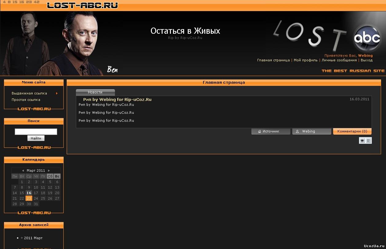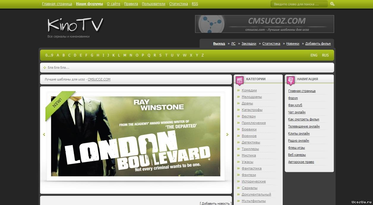 Kino TV - Оригинальный шаблон для сайтов uCoz.Уникальный, а главное красивый, он выполнен в темных тонах, в его конструкции присутствует темно-зеленый цвет.Одна сторона блоков, красивая и функциональная шапка,с одним местом для баннера размером 468x60, многофункциональный поиск и другие прелести есть в этом шаблоне.Он подойдет для сайтов о кино...Для удобства его использования, при адаптации я (booooooooy) разделил этот шаблон на четыре глобальных блока - Верх,Низ,Блоки и Слайдер...