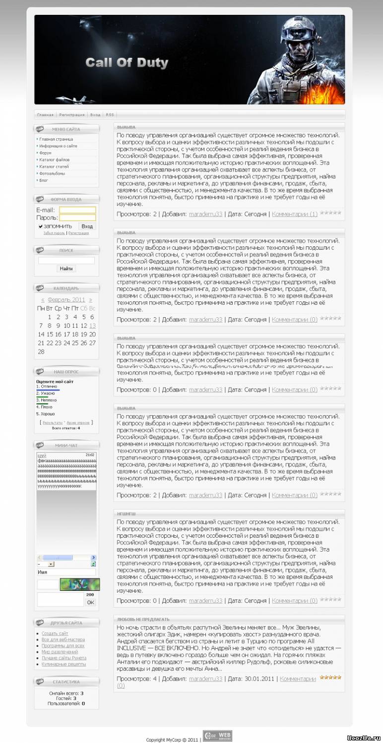 Описание: Шаблон сайта uNet а вернее переделка шаблона, сайта uNet. Шаблон переделан под uCoz сайт, для разных материалов. Шаблон очень легкий и простой. Кстати он сделан почти весь только на CSS. (Есть две или три картинки). Конечно же шаблон можно перекрасить в любой, другой цвет или переделать его полностью.