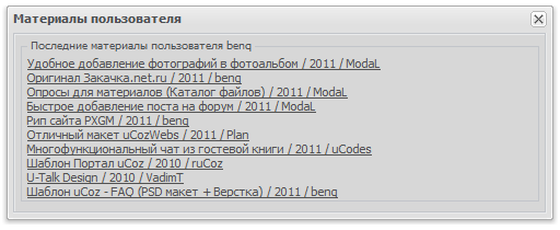 Теперь на персональной странице пользователя можно увидеть десять последних, добавленных материалов пользователя. Кстати это мой первый скрипт с .get системой. По скрипту помогал ModaL с сайта uWeb. Скрипт немного подгружает страницу профиля но сильно это не напрягает сам сайт! Всё подробно о установке и т.д. в полном виде материала! Автор данного скрипта benq ну и как сказал уже при помощи ModaL.